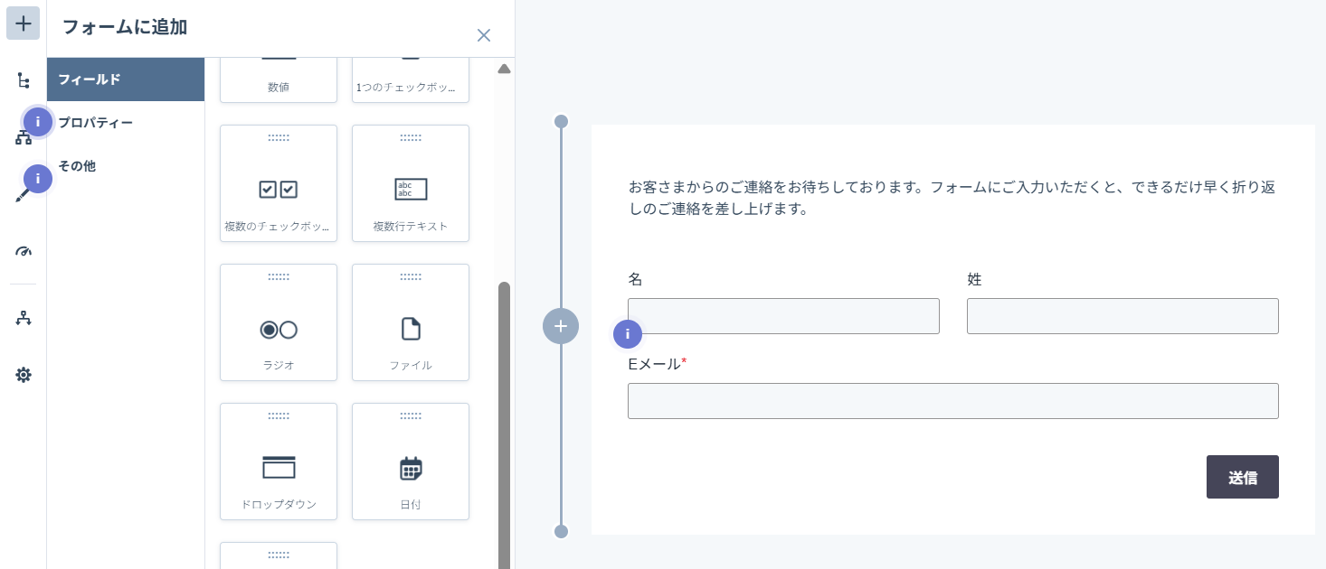 左側のパネルにある「コンタクトプロパティ(姓、名、Eメールなど)」の一覧から、必要な項目を右側のプレビュー画面へドラッグ&ドロップするだけで追加できます。