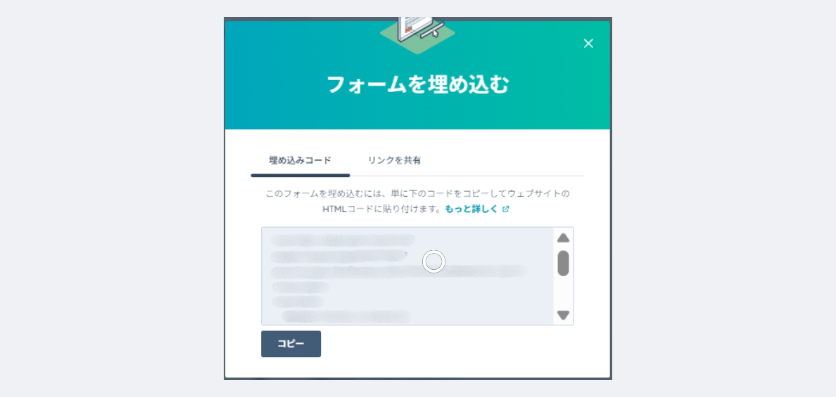 まず、作成したHubSpotフォームのデータを呼び出すための「埋め込みコード」を取得します。