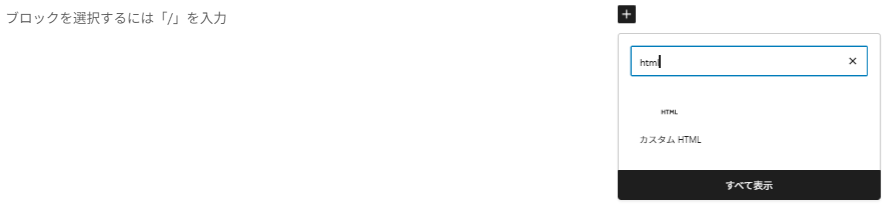 - フォームを入れたい場所にブロックを追加し、[カスタムHTML]を選択します(検索窓で「html」と打つとすぐ出てきます)。