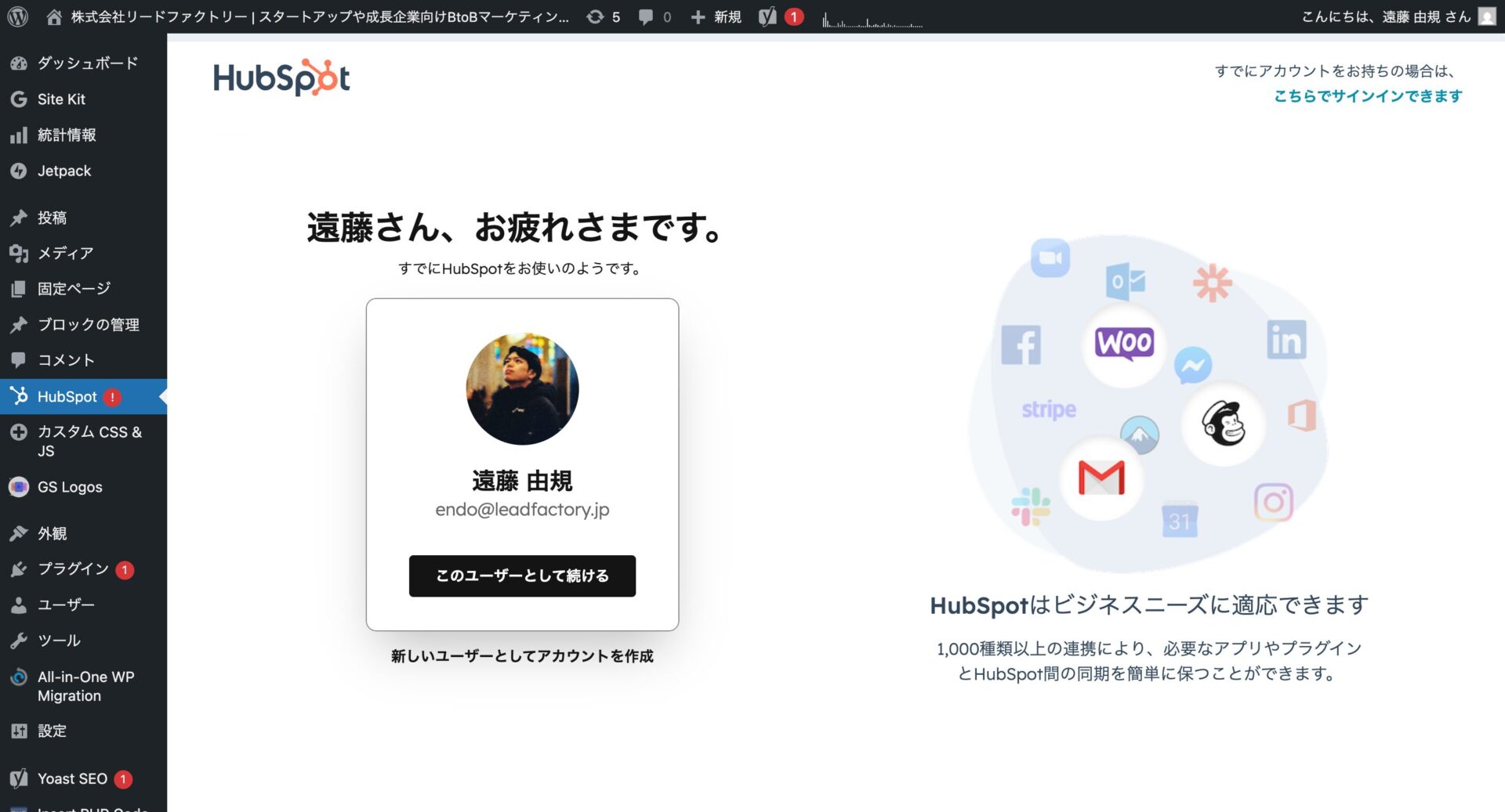 - プラグインの設定画面でHubSpotアカウントにログインし、連携を完了させます。