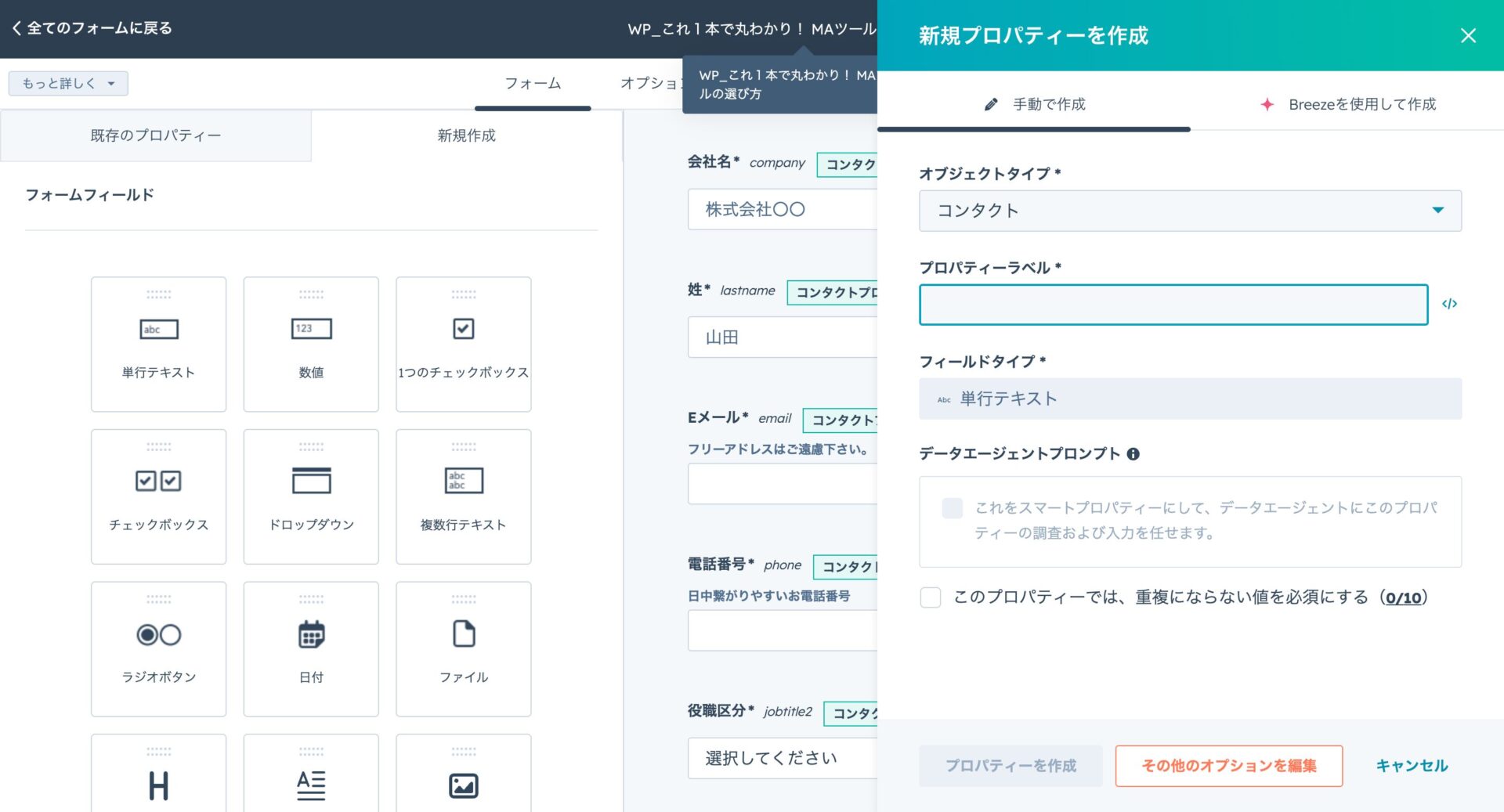左側のリストに欲しい項目(例:「ご予算」「導入予定時期」など)が見当たらない場合は、HubSpot上にそのデータを格納する場所(プロパティ)がまだ存在しないことを意味します。