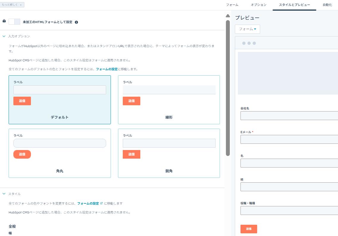 この設定を有効にすると、HubSpotが持っているデフォルトのデザイン設定(CSS)がすべて無効化され、HTML構造だけの「素のフォーム」が出力されます。